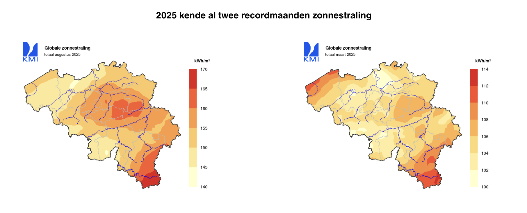 Dé topmaand dit jaar bleek alvast juni te zijn, met een globale zonnestraling van 180,8 kWh/m². Juli kwam nog in de buurt, met 172,9 kWh/m², daarna beleefden we de beste augustusmaand ooit gemeten. Met 157,1 kWh/m² werd het 16 jaar oude record van 154,5 kWh/m² van de tabellen geveegd. In de Kempen en Belgisch-Lotharingen werden de hoogste waarden genoteerd. Maar ook eerder dit jaar sneuvelde al een maandrecord. Zo werd in maart een globale zonnestraling van liefst 103,7 kWh/m² opgetekend, of 0,4 kWh/m² méér dan tijdens de vorige recordmaart in 2022. Opvallend is dat toen vooral aan de kust en in Luxemburg de waarden sterk de hoogte ingingen.