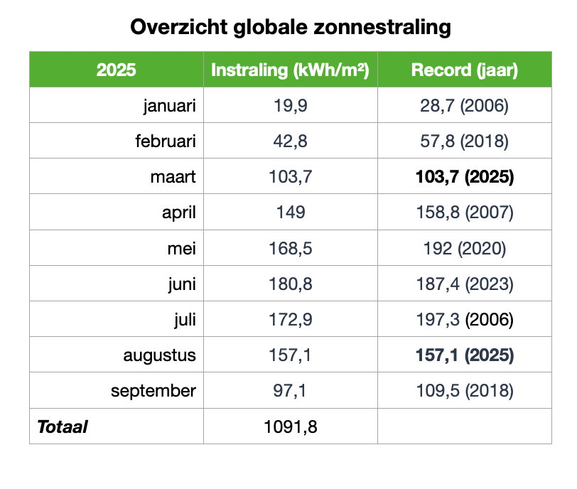 Tot en met eind september is ons land al getrakteerd op ruim 1.666 uren zon, of ruim een derde meer dan in dezelfde periode vorig jaar (+37%). Mooie cijfers, maar geen record. Wat wel op recordkoers ligt, is de instraling die je effectief kan omzetten in energie. Die kwam in de eerste negen maanden van dit jaar uit op liefst 1.091,8 kWh/m². Dat is bijna een vijfde méér dan in heel 2024.