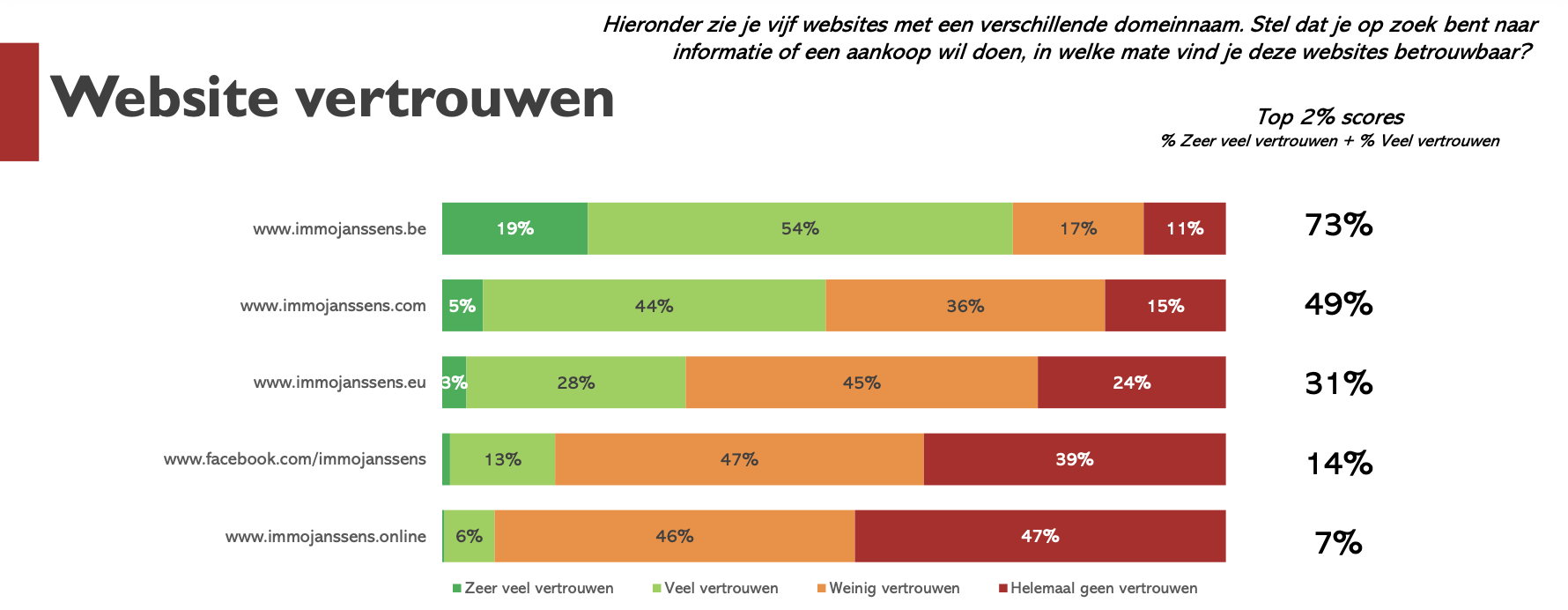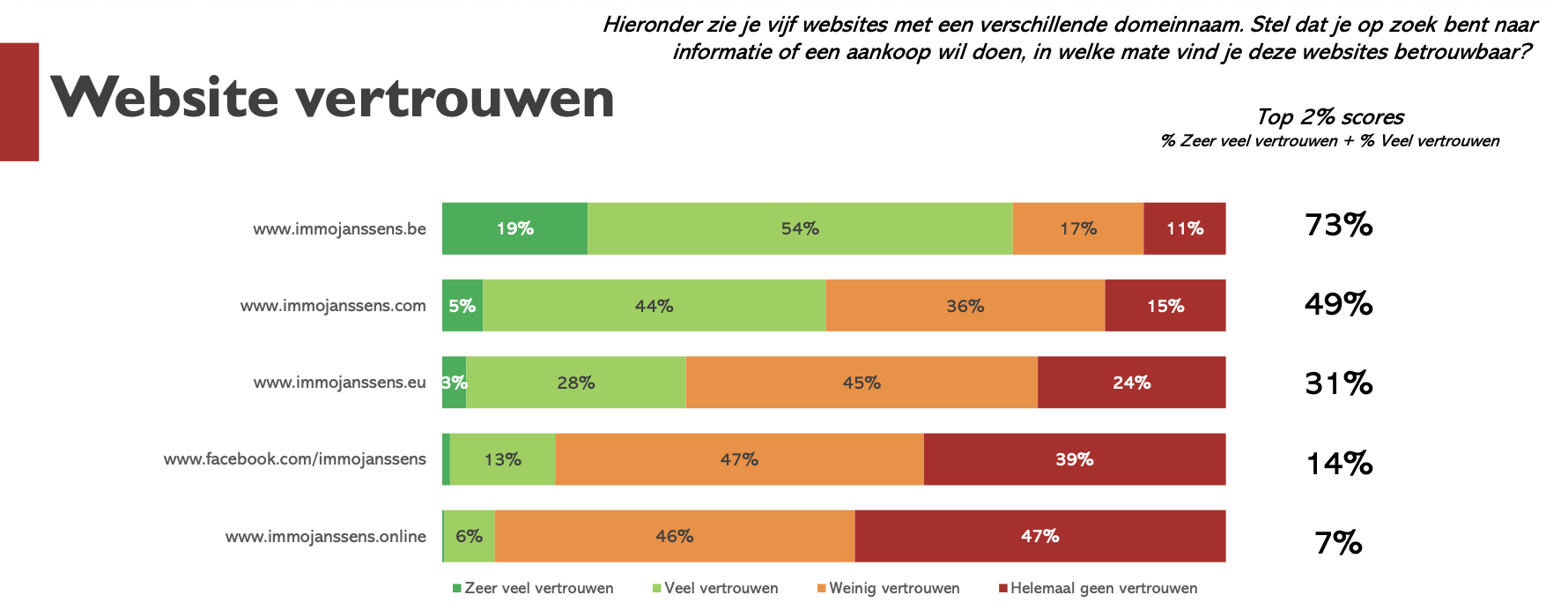 Want opvallend: bijna één op de vier Belgische ondernemers is vandaag nog helemaal niet online aanwezig en heeft dus geen website én geen sociale media. Anderen kiezen niet altijd voor een website met een .be-extensie, maar gaan bijvoorbeeld voor een website op een .com, .eu- of .online-domein. Ook die keuze roept vragen op; 73% van de Belgen vertrouwt een website met een .be-domeinnaam het meest, ver voor .com (49%), .eu (31%) en .online (7%).