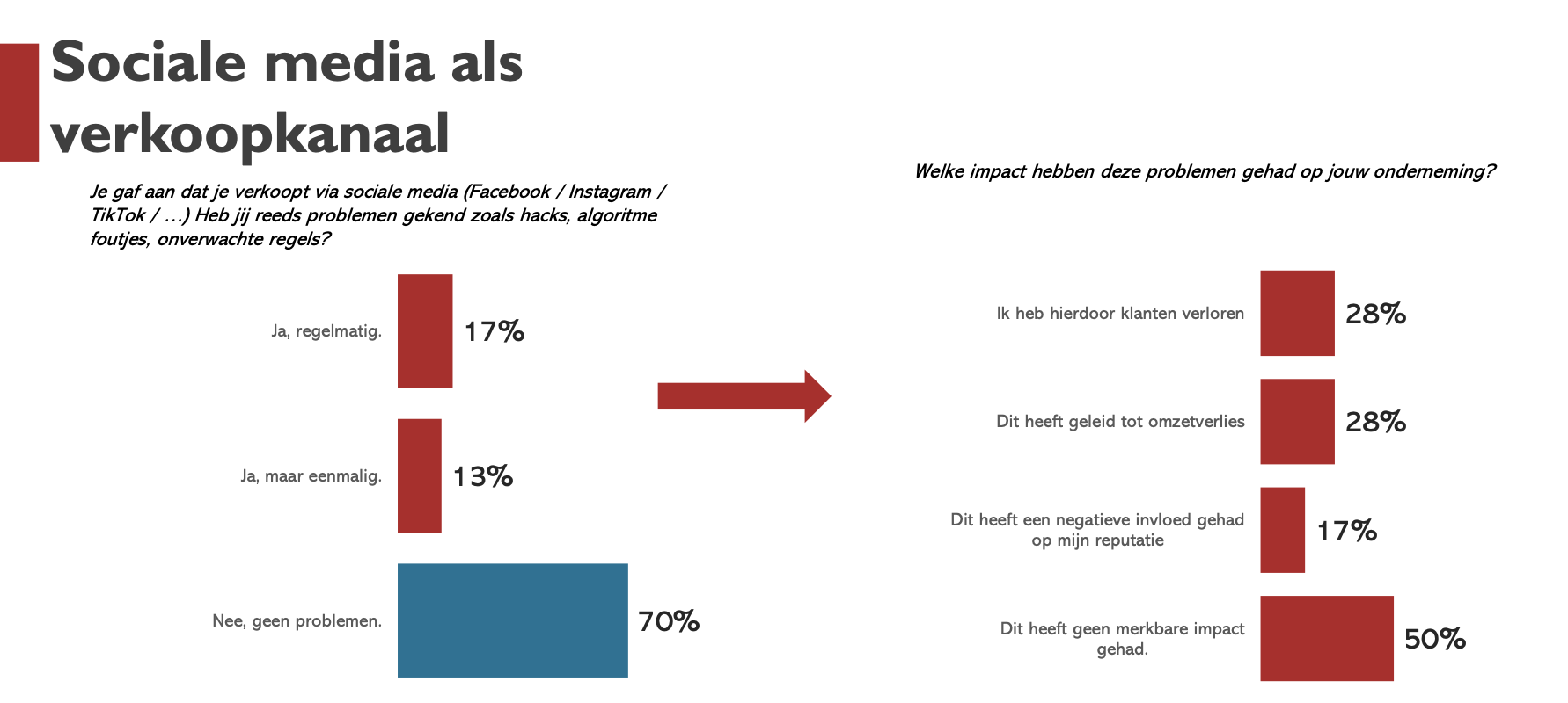 Toch lijken Belgische ondernemers het wantrouwen van de Belgische consument niet altijd op te pikken: 1 op de 8 van de Belgische ondernemers blijft verkopen via sociale media. Nochtans speelt dat blind vertrouwen niet altijd in hun voordeel: 1 op de 3 van hen geeft aan al problemen te hebben ondervonden door algoritme-fouten, onverwacht gewijzigde policy-regels of hacking. En de helft verloor er zelfs al omzet en klanten door.