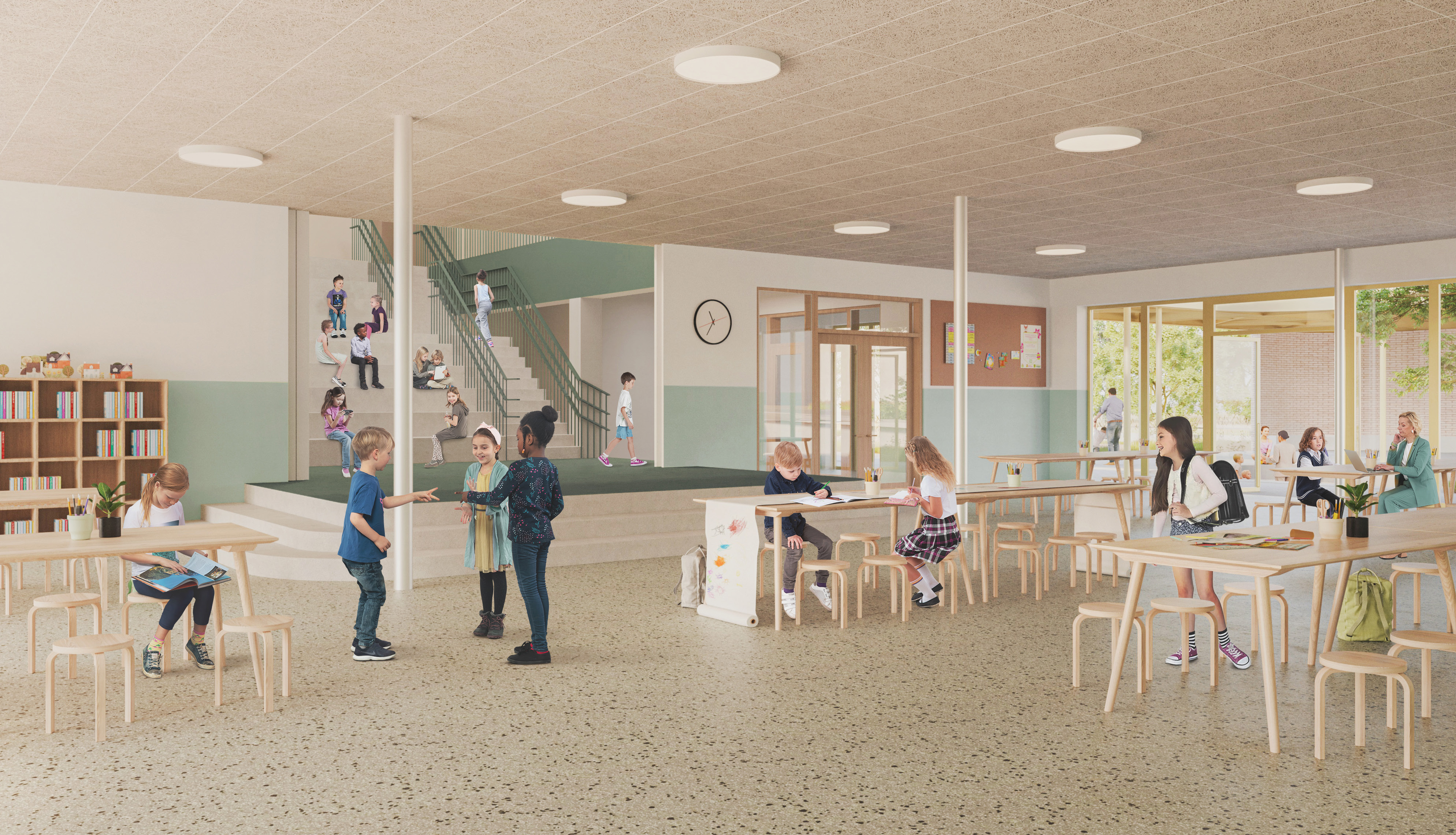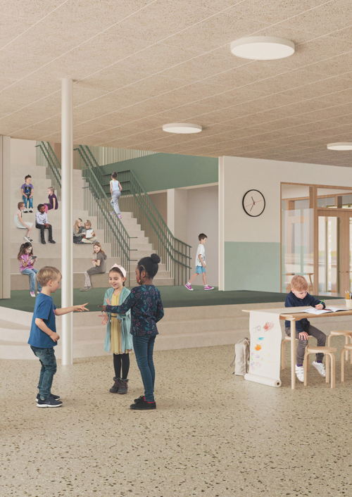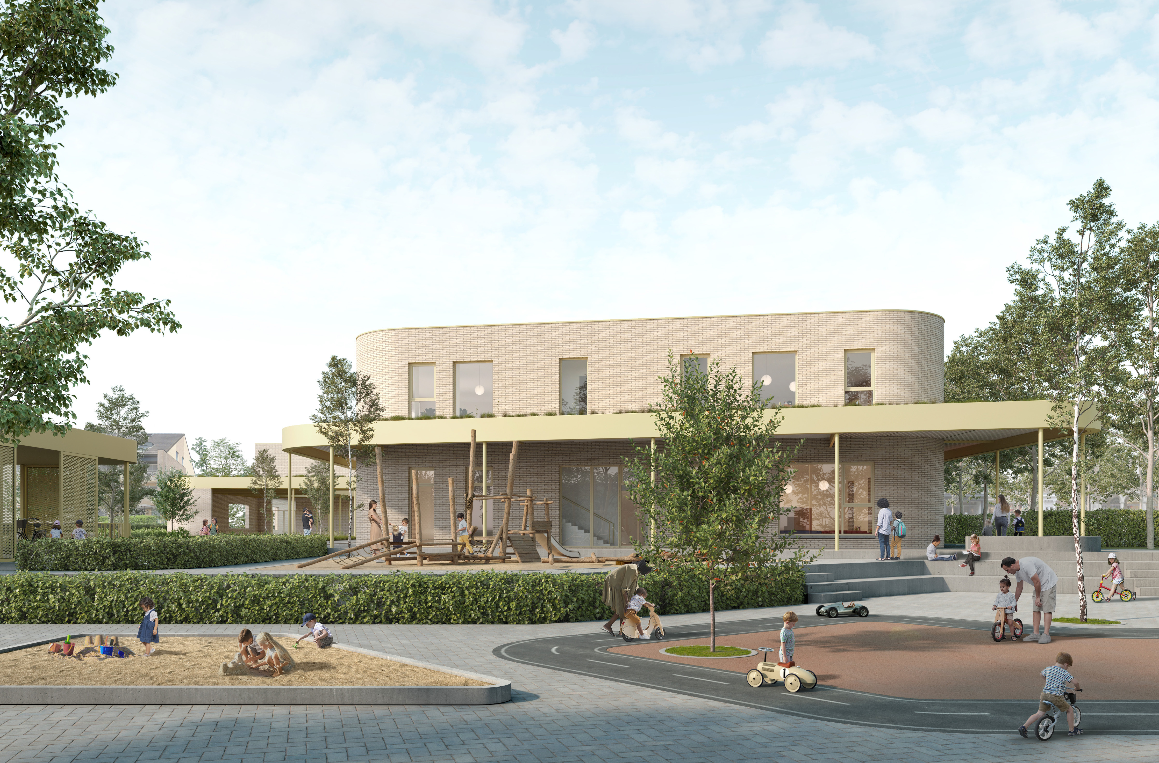 De speelomgeving biedt afwisseling: actieve én rustige zones voor kleuters en lagere school. Voor kleuters voorziet het plan onder meer kleutertuintjes met een directe link naar de klassen en een overdekte speelplaats die de verschillende toegangen verbindt. Voor de lagere school liggen rustige plekken verspreid rond de luifel, en een buitentrap leidt naar een actieve speelzone op het dak van de refter, met meerdere sportvelden. Het glooiende terrein speelt mee als extra laag in de beleving.