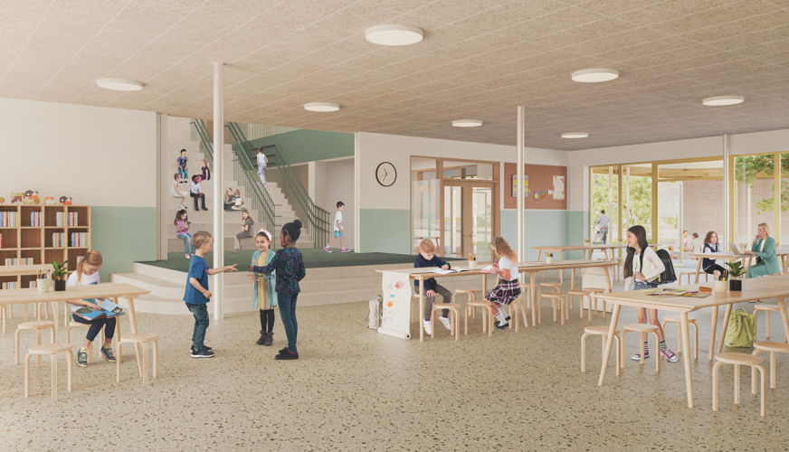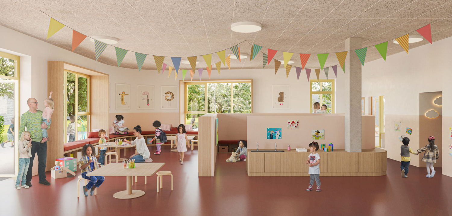 “Wij zetten heel bewust in op één gezamenlijke startplek. Iedereen komt langs dezelfde kant binnen, je start de dag samen en je voelt meteen: dit is één school, één huis. Dat versterkt ons familiale karakter en maakt ontmoeting vanzelfsprekend: kinderen onderling, ouders met leerkrachten. Ook de samenwerking met het toekomstige kinderdagverblijf dat ook een plek krijgt op de schoolsite maakt het samenwerkingsverhaal compleet. Dat dagelijkse ‘samen toekomen’ past perfect bij hoe wij school maken.”