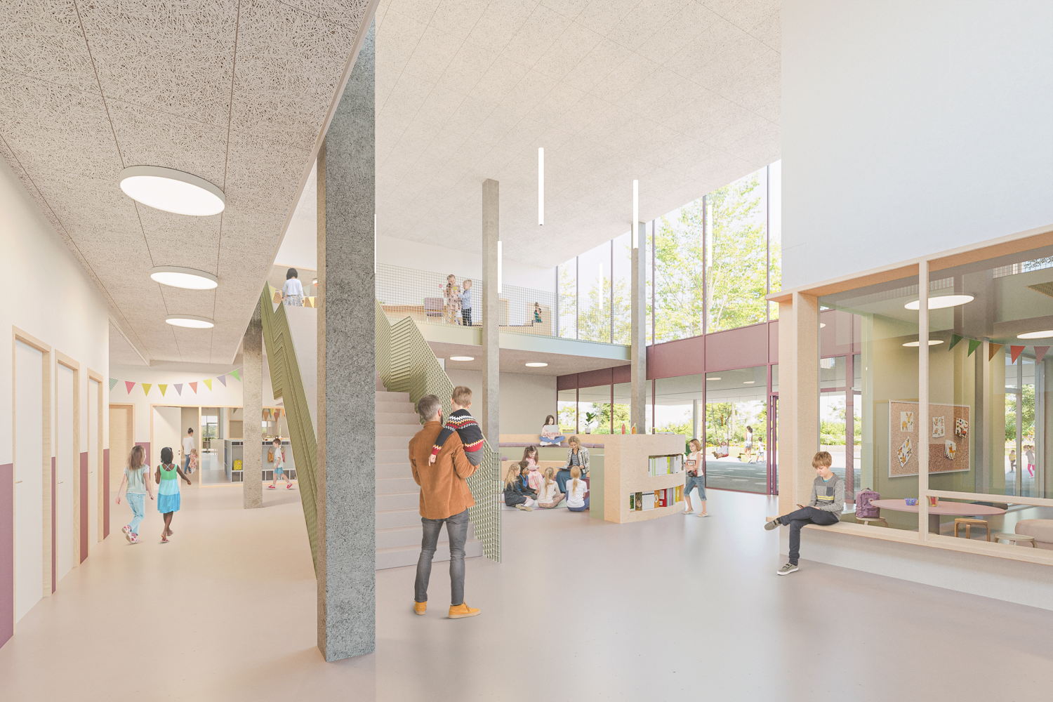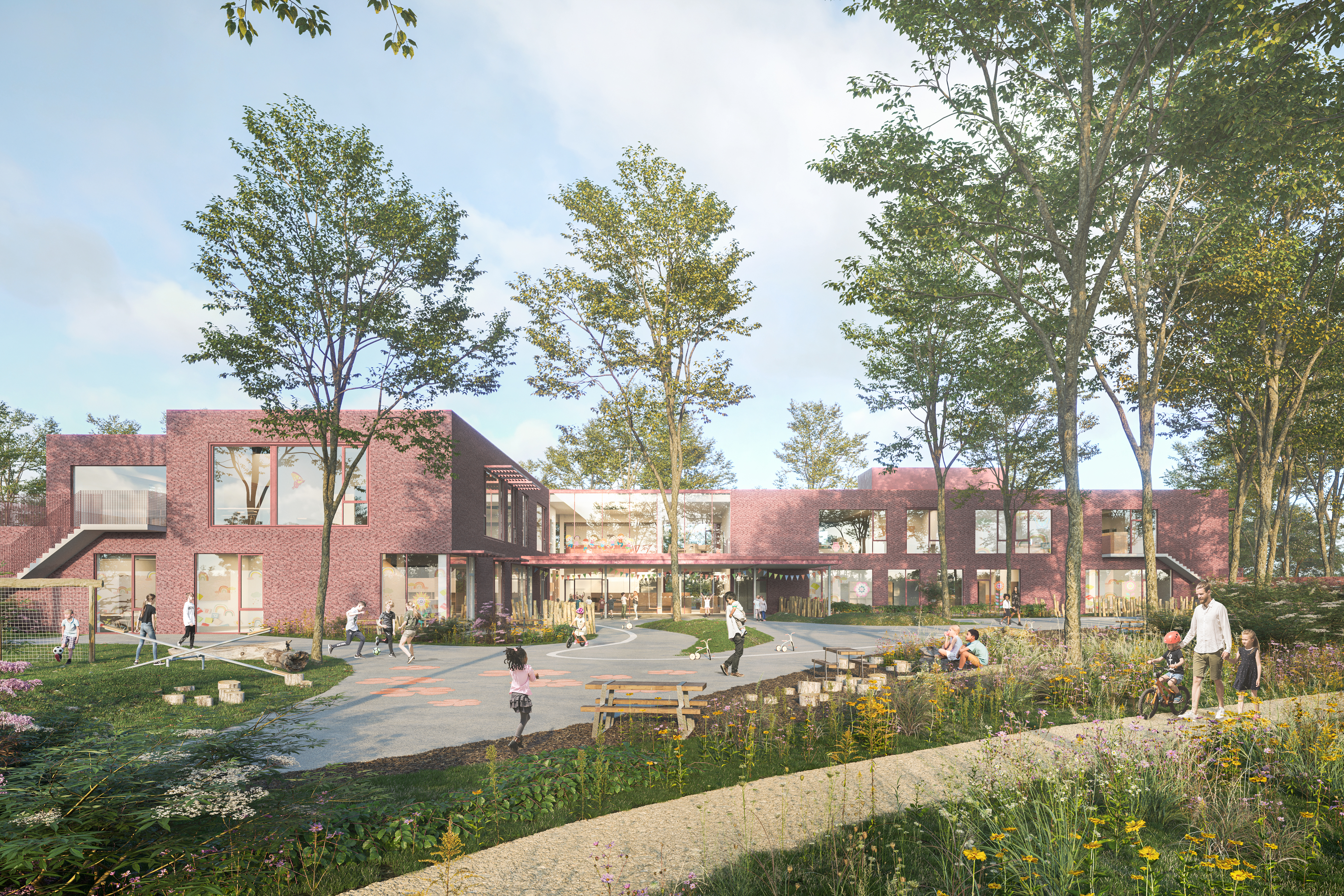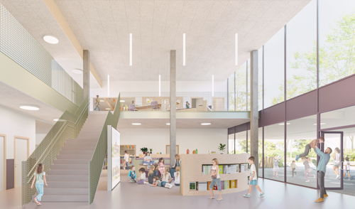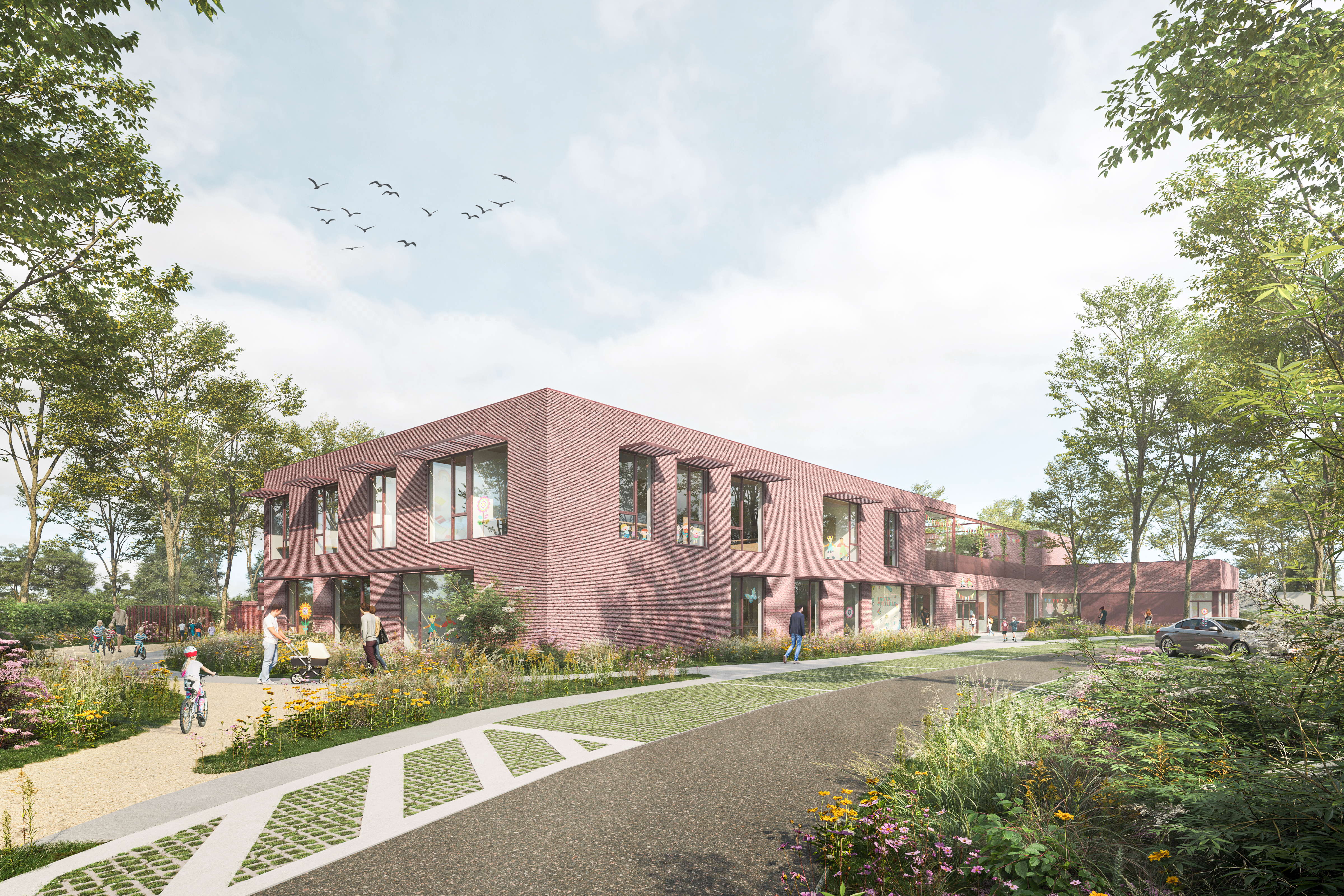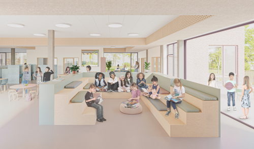 “Onze nieuwe school wordt een open, uitnodigende plek waar kinderen samen leren in flexibele leeromgevingen. Het atrium vormt het kloppend hart van het gebouw: daar brengen we voorstellingen en tonen we wat er in de klas groeit en ontstaat. Rondom dat centrale hart bevinden zich de landschapsklassen, met verschillende hoekjes voor instructie, stilte, spel en ontdekkend leren. Zo creëren we ruimte voor elk kind om op zijn eigen tempo te groeien en zijn talenten te ontwikkelen.”