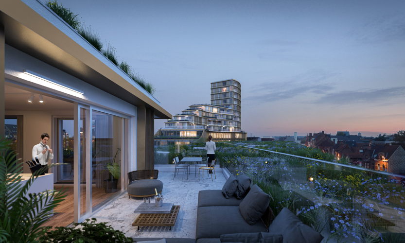 “Maar liefst 2.650 vierkante meter aan groendaken zorgt bovendien voor een warmte- en waterbuffer en verbetert de luchtkwaliteit in de directe omgeving. Daarnaast planten we diverse, kleurrijke bloemen en planten op de groendaken, wat het uitzicht van bewoners nog een stuk aangenamer maakt. En verder biedt Roelevard ook het strafste uitzicht op Roeselare. Nergens anders kan je zo wijds uitkijken over de stad.”