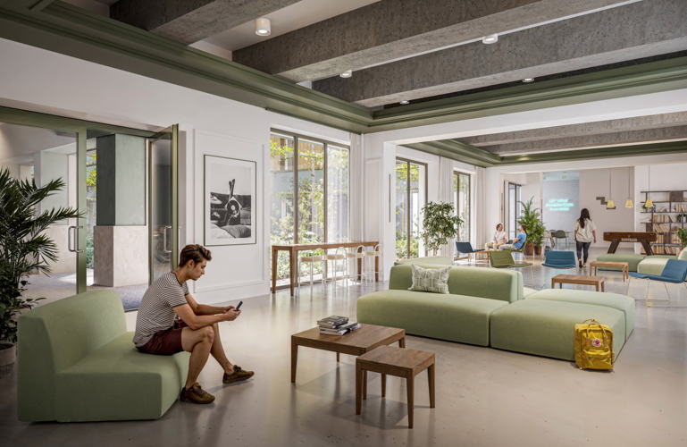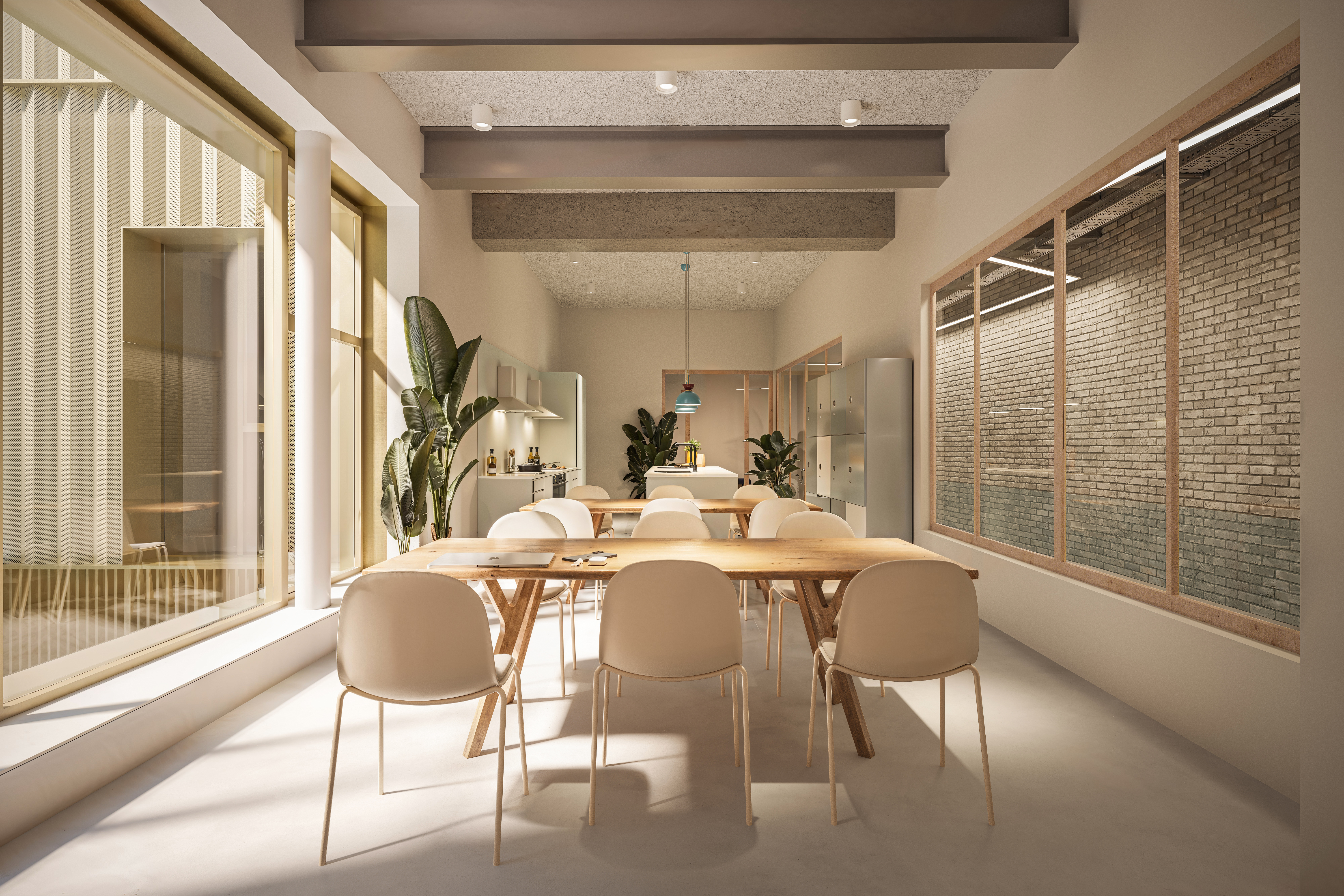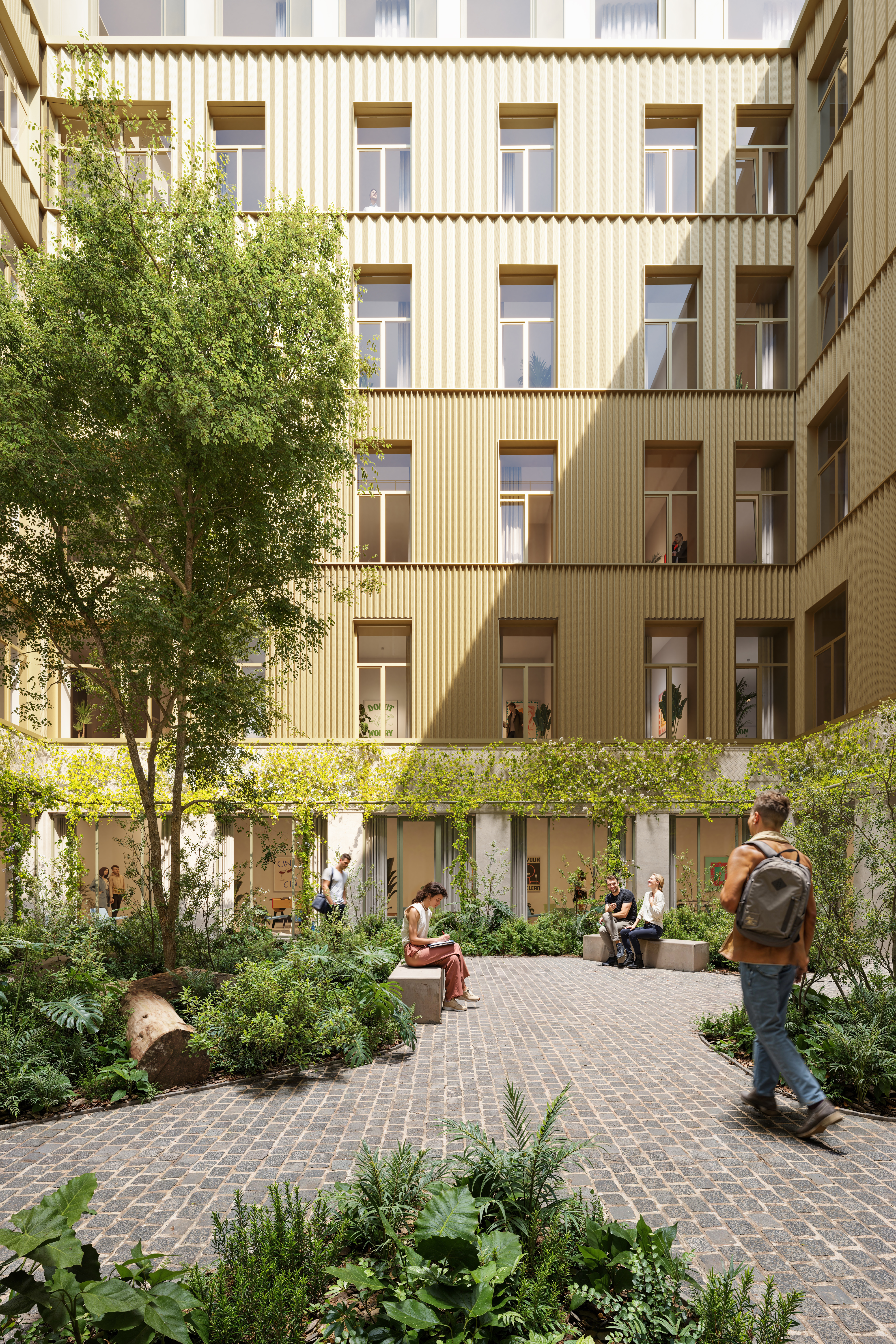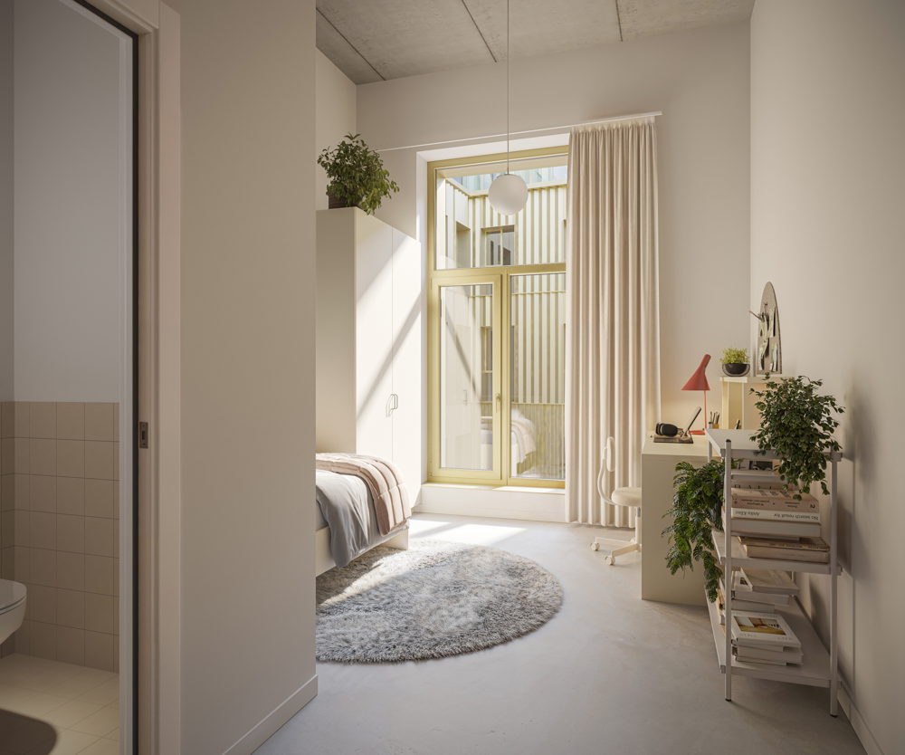 “Concreet blijven de draagmuren behouden, net als de vloeren en de gevels. Ook de bestaande raamindelingen behouden we – die bepalen het aantal kamers. In het gebouw zit een atrium met een glazen dak. Dat gaan we opentrekken tot een levendige, groene buitenruimte, waar studenten elkaar kunnen ontmoeten en genieten van rust. Alle gemeenschappelijke ruimtes komen daarop uit. Met een soort binnenstraat maken we de verbinding met de straatkant, wat een fantastische stedelijke connector wordt. In plaats van functies bovenin weg te stoppen, houden we ze op het straatniveau. Bovenop het gebouw voorzien we een panoramisch dakterras met fenomenaal zicht op de stad.”