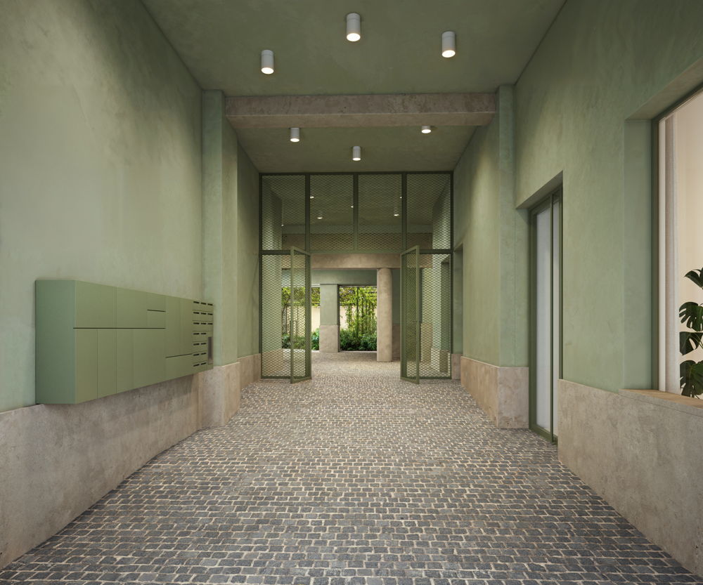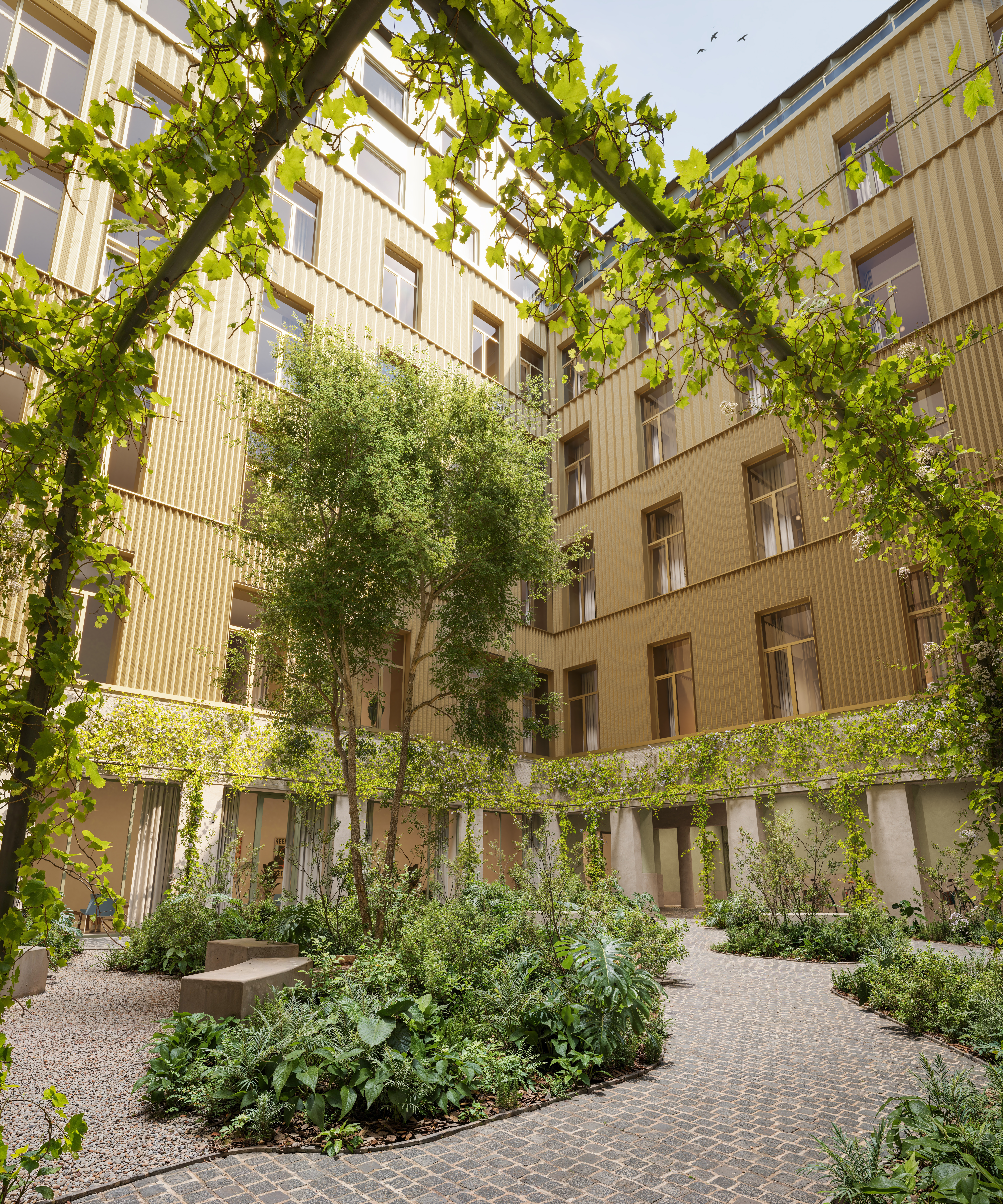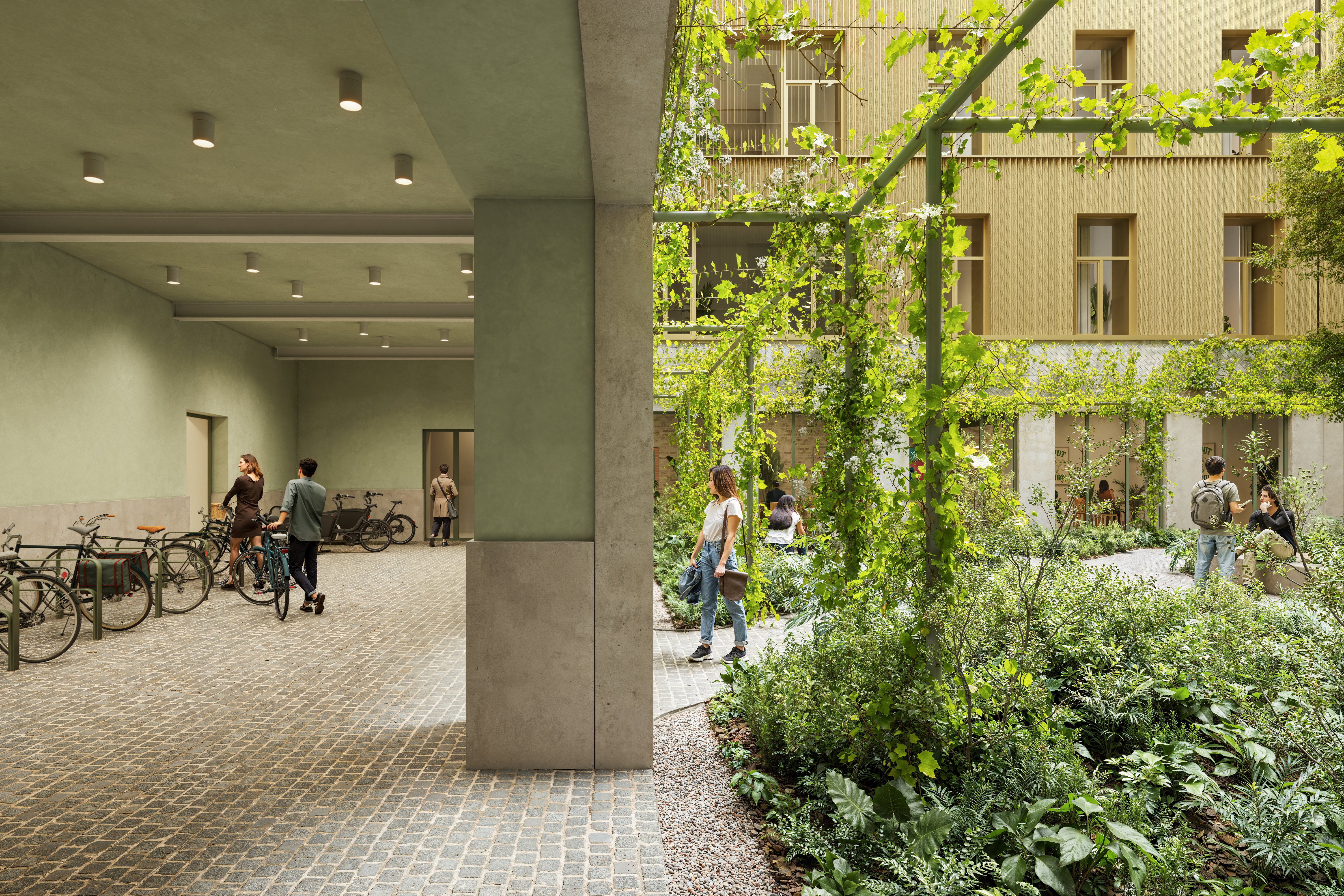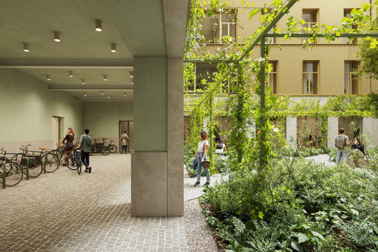 “Concreet blijven de draagmuren behouden, net als de vloeren en de gevels. Ook de bestaande raamindelingen behouden we – die bepalen het aantal kamers. In het gebouw zit een atrium met een glazen dak. Dat gaan we opentrekken tot een levendige, groene buitenruimte, waar studenten elkaar kunnen ontmoeten en genieten van rust. Alle gemeenschappelijke ruimtes komen daarop uit. Met een soort binnenstraat maken we de verbinding met de straatkant, wat een fantastische stedelijke connector wordt. In plaats van functies bovenin weg te stoppen, houden we ze op het straatniveau. Bovenop het gebouw voorzien we een panoramisch dakterras met fenomenaal zicht op de stad.”