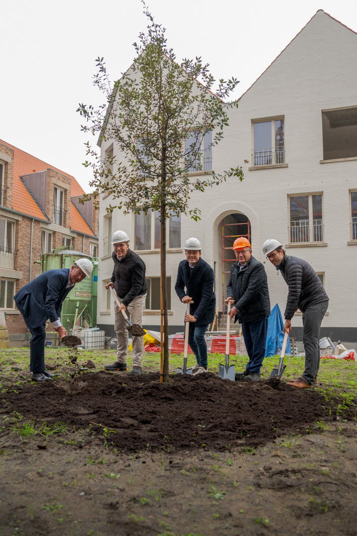 De nieuwe klimaatvriendelijke woonbuurt Boevrie, op de voormalige VTI-site in Brugge, zet opnieuw een grote stap vooruit. Vandaag werd, samen met burgemeester Dirk De fauw en schepenen Franky Demon en Mathijs Goderis, symbolisch de eerste boom geplant. Daarmee starten de omgevingswerken en opvallend: er komt de helft méér groen dan oorspronkelijk voorzien. Ondertussen is ook de ruwbouw en afwerking al ver gevorderd en kunnen geïnteresseerden zelfs al een kijkje nemen in twee volledig afgewerkte modelappartementen.